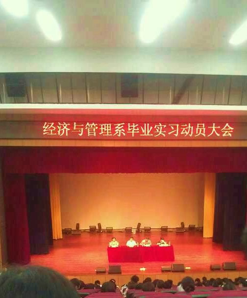 2013年6月19日晚,经济与管理系在音乐厅召开了2014届毕业生实习动员大会。系主任彭分文、副主任王志和、王晓军、副书记刘红燃以及个教研室主任、2010级班主任2014届全体毕业生参加了会议,会议由系主任彭分文主持。