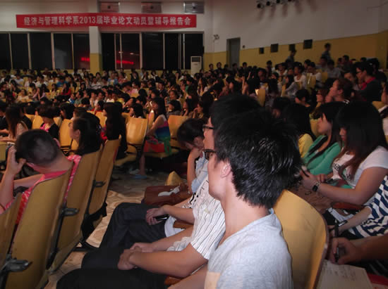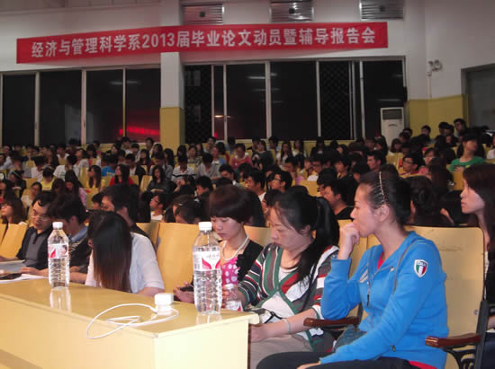 为了提高学生对于毕业论文的重视程度,进一步提高本科毕业论文质量,经济与管理科学系于6月5日(第16周二)晚在匠成楼多媒体报告厅召开了2013届毕业生毕业论文动员暨辅导讲座,经济与管理科学系全体专业教师和2013届毕业生参加了动员暨辅导讲座。会议由系主任彭分文教授主持。