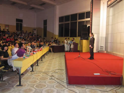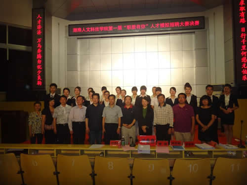 2012年5月30日晚,由校招生就业处和校团委主办,经济与管理科学系团总支和经济与管理科学系人力资源管理教研室承办的校第一届“职要有你”人才模拟招聘大赛决赛在匠成楼报告厅隆重举行。校党委委员、副校长刘铁铭,招生就业处处长彭晓华,学生工作处处长刘铁峰,经济与管理科学系党总支书记刘辛田,经济与管理科学系主任彭分文,各系分管招生就业工作的领导、招生就业专干和团总支书记一起观看了比赛,团委书记谢柳、美术系党总支书记尹钟宏、招生就业处副处长刘志伟、物理与信息工程系党总支副书记刘辉和经济与管理科学系人力资源管理教研室主任李晚芳担任大赛评委。