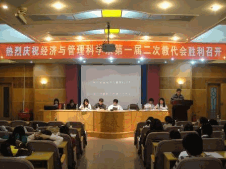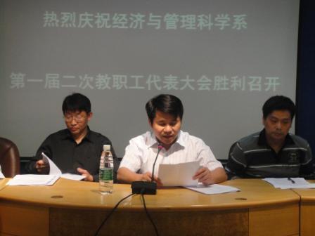 晚上7:30分,在庄严的国歌声中,大会正式开始。首先,经管系党总支书记刘辛田致开幕词,周发明副校长代表学校作了重要讲话。紧接着,系主任彭分文教授作了《真抓实干,扎实推 进,谋求经管系科学发展》的工作报告,报告回顾了2010年系部工作的主要成绩和存在的问题,对2011年的主要工作作了部署;系分工会主席刘红燃作了《扎实工作,开拓进取,共创我系工会工作新局面》的工会工作报告。在会上,系主任彭分文教授还就《经管系校内津贴分配方案》修订草案作了说明。然后,大会分组讨论了系主任工作报告、工会工作报告及经管系津贴分配方案修订案,第三 代表组组长王业良老师在会上集中反馈了各代表组的讨论情况。会议举手表决通过了系主任工作报告、工会工作报告和经管系校内津贴分配修订方案。