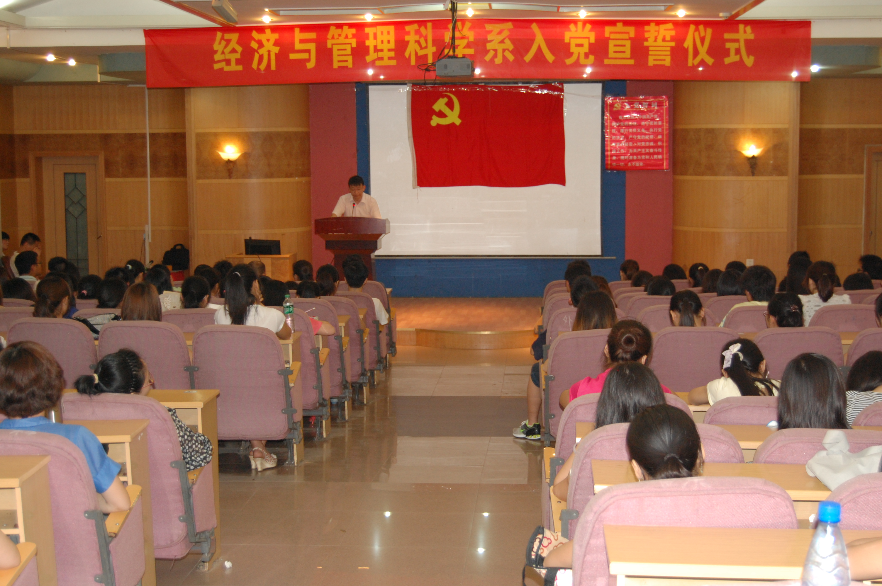 本次活动共分为四个阶段。第一阶段,经管系全体党员在总支书记刘辛田老师的带领下,在养根楼多媒体报告厅举行了“新党员入党宣誓、老党员重温入党誓词”活动。面向鲜红的党旗,全体党员向党旗致敬,庄严宣誓,表明我们为党的事业、为共产主义奋斗终生的决心,进一步深刻认识所肩负的光荣责任和崇高历史使命,并始终牢记党的宗旨和奋斗目标。宣誓仪式上,刘辛田书记向新入党的同志表示祝贺,并向全体党员致以节日的问候。他指出,在建党90周年来临之际,我们在这里隆重举行“新党员入党宣誓、老党员重温入党誓词”活动,具有特殊的纪念意义,“共产党员”的身份是庄严而神圣的,我们要时刻感受到这几个字的非常分量,要积极面对压力和挑战,爱岗敬业、奉献进取,以良好的精神状态,充足的干劲,不断创新的激情,坚持共产党员五带头,在经管系的各项事业中积极发挥共产党员的先锋模范作用。