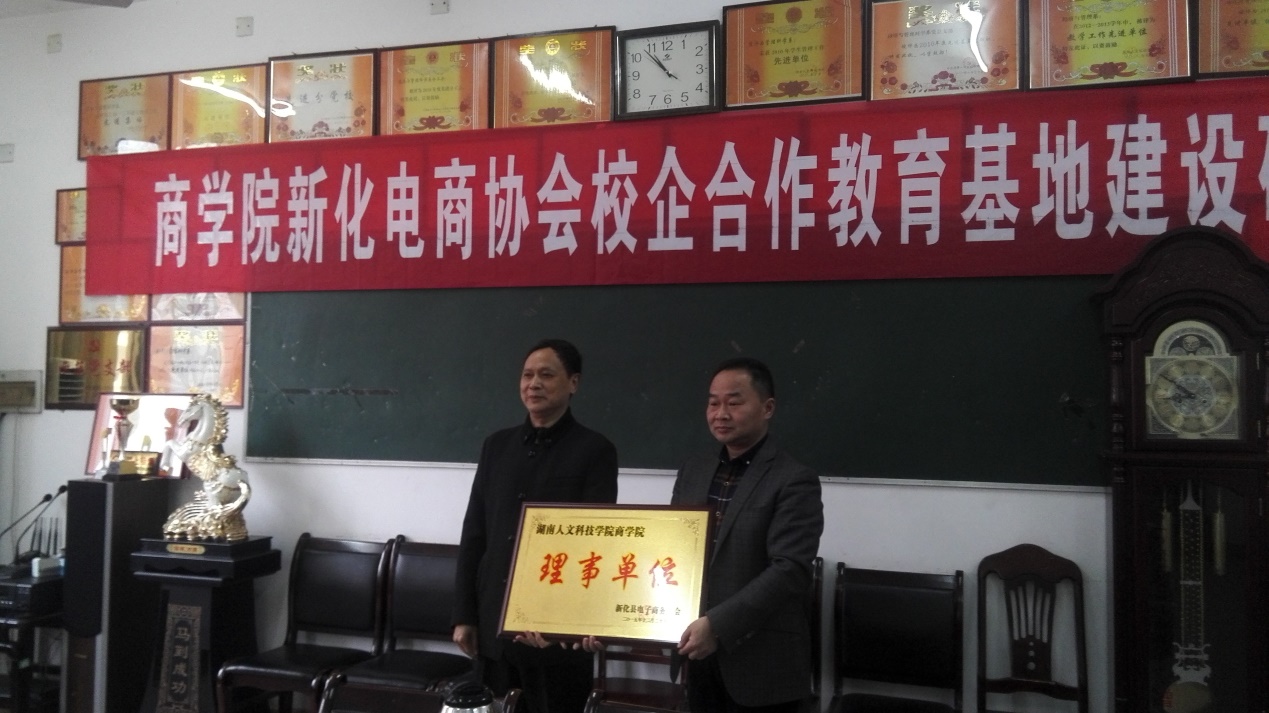 新化电子商务协会会长刘应知表示很荣幸有机会与大家一起探讨电子商务的发展,此次议题有两个,一是为44118太阳成城集团商学院成为新化电子商务协会理事单位授牌,二是带领团队与商学院共商校企合作基地建设大计。他对新化电子商务协会的成立及运行现状进行了详细的介绍,对新化发展电子商务的优势、劣势进行了剖析,提出了新化电子商务发展主要面临三大问题,一是企业规模小、不规范;二是缺乏电商人才;三是观念落后。他认为44118太阳成城集团有较优秀的人才库、智囊团、造血机,借助这些人才的力量能帮助、推动新化电子商务的发展,新化电子商务协会与44118太阳成城集团的合作是强强联合,发展前景很好,成长性较强。刘会长对商学院与新化电子商务协会的合作提出了七大设想,即:对电子商务技能型人才的短期培训;为EC从业人员进行继续教育、提升教育;促进EC初级、中级、高级人才教育;开展对旅游、商贸、管理、营销等创新创业人才的培训;联合开展娄底市、县的电子商务发展对策研究等调研工作;可编写一些关于电子商务的乡土教材、乡土资料作为校企合作教材参考资料;可联合举办一些关于电子商务、文化旅游的论坛、峰会、沙龙等活动,以此整合各方资源,包括专家意见、国家意见、实战人才意见及广大参与者意见,讨论农业电子商务的问题,并提出解决方案,希望在44118太阳成城集团商学院的帮助下把新化电子商务各项活动做得越来越好,增强造血功能。