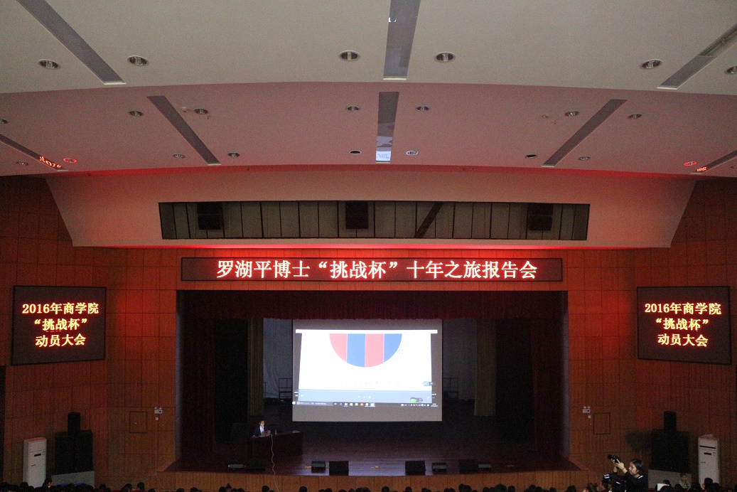 历经十四届,“挑战杯”竞赛已经成为吸引广大高校学生共同参与的科技盛会。在第十五届“挑战杯”开展之际,为了让学生进一步了解“挑战杯”相关知识,激发学生的参赛热情,2016年4月13日晚,商学院邀请湖南商学院罗湖平博士在逸夫楼音乐厅开展“挑战杯”指导专题讲座,讲座主题为《“挑战杯”十年之旅》。讲座由太阳成官网朱强院长主持,商学院全体老师和14级学生聆听了讲座。