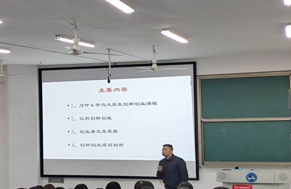 胡书记的演讲主题是:培养创新意识,提升创业能力。讲座围绕“开设创新创业课程的必要性、新时代创新创业的内涵、创业者的素质、创新创业项目剖析等四个主要内容展开。胡书记首先引用“擦车”的短片指出创新创业方向选择的重要性,然后纠正了学生错误的“创业观”,指出创业的意义不在于“当老板、说了算”,而是通过整合资源,注重社会协作和团队配合,创造更多的社会价值。接着以比尔盖茨、乔布斯等几位名人的例子来指导学生如何正确的看待创业,其指出创业要注重以下三点:第一创业需要理性;第二创业离不开超群的能力;第三创业需要掌握一定的资源。
