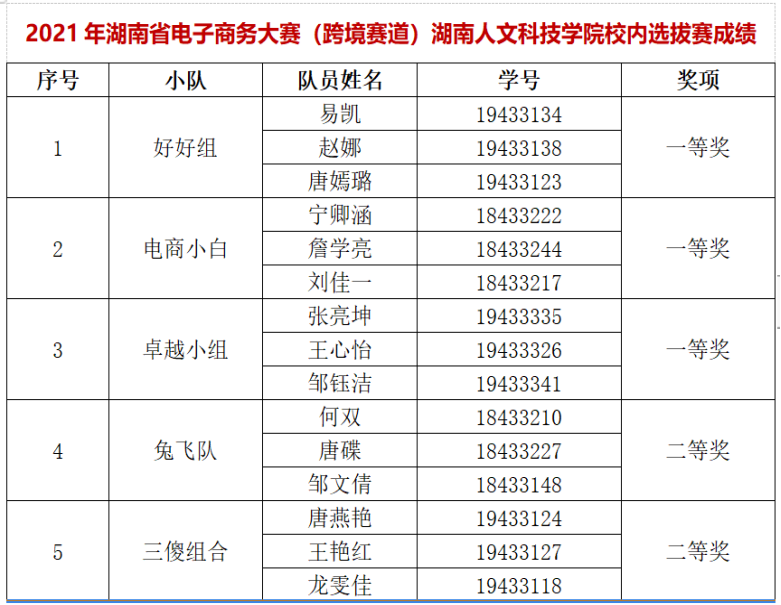 自比赛通知发布以来,共有27支团队报名参加(跨境专项赛),学生经过半个多月的操作训练和多次模拟实训,于5月26日19:30-21:30、5月27日16:00-18:00正式参加跨境专项赛的校内选拔赛。比赛分为B2B、B2C两个实训模块,学生以个人参加,成绩分别计算两个模块的团队平均分。为确保比赛的公平性,所有参赛学生集中在同一机房进行,并由两位教师全程监督,所有成绩数据由比赛平台导出。经过激烈的角逐,易凯等同学组成的“好好组”、宁卿涵等同学的“电商小白”组、张亮坤等同学组成的“卓越小组”获得比赛的一等奖,被推选参加省赛。
