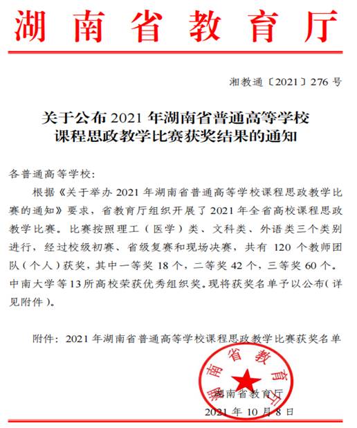太阳成官网根据《关于举办 2021 年湖南省普通高等学校课程思政教学比赛的通知》以及学校比赛要求,积极组织教师参赛,校赛文科组郑清华老师获二等奖、李孛老师获三等奖,其中郑清华代表学院参加省级复赛和现场决赛,并获优异成绩。