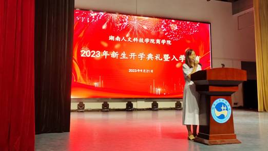 威严神圣的国歌之后,2023级数字经济一班程曦同学作为新生代表发言,她认为大学新生应尽快适应新的环境,努力绽放出属于自己的精彩,不断把青春梦融入中国梦之中。2022级财务管理一班黄子怡同学作为老生代表发言,她和新生分享了自己的大一生活,并结合自身经验对大一新生提出保持身心健康、多参加课外实践活动等宝贵建议。