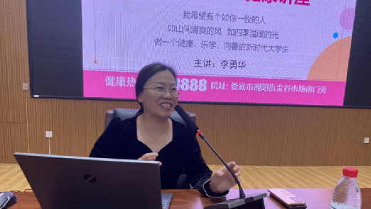 娄底丽人妇产医院李勇华主任进行了女性健康知识宣讲。她主要介绍了女性在生活中常见的健康问题,着重强调了“艾滋梅毒”防治及毒品危害,并通过有奖问答环节与同学们进行了沟通与交流。