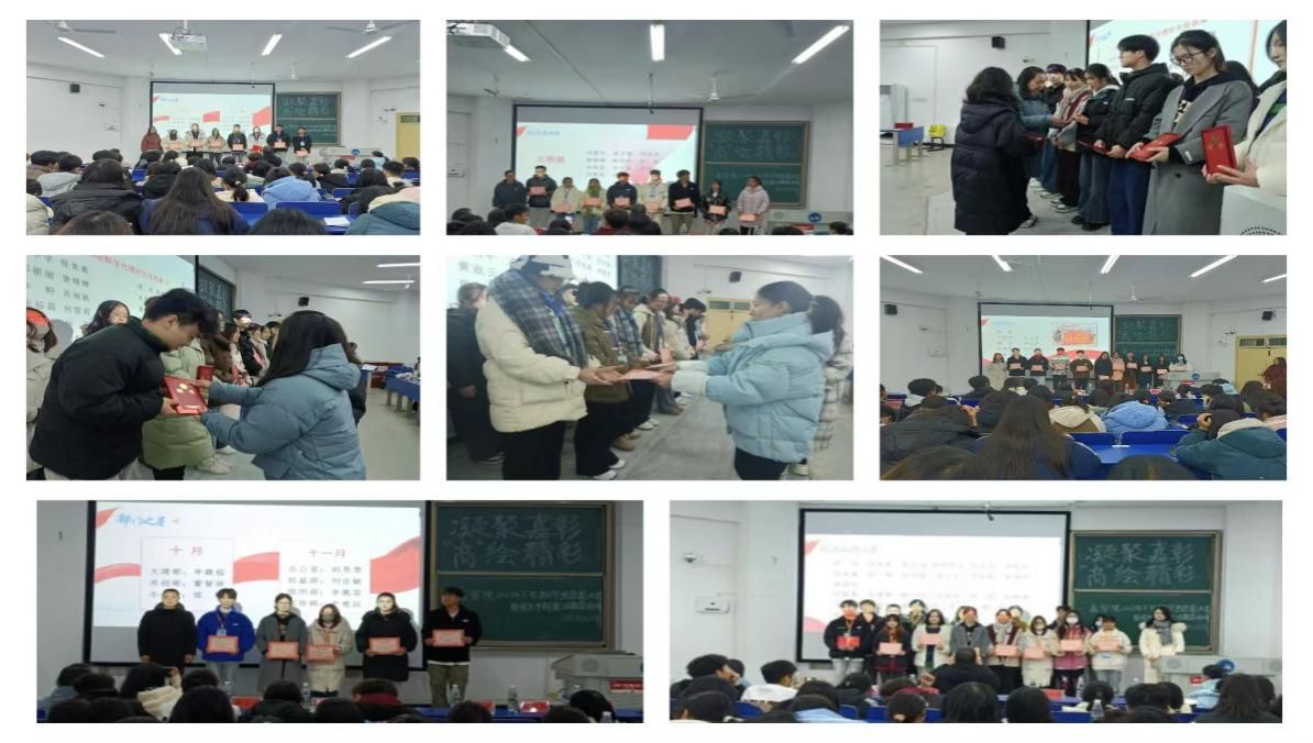 12月18日晚,商学院2023年下学期学生表彰大会于致远楼119教室举行。学院党总支副书记胡益龙、全体辅导员出席会议,团学会全体学生干部、各班班长以及受表彰学生参加大会。会议由辅导员刘佳瑶主持。