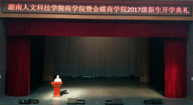 9月27日晚上19点35分,商学院在逸夫楼音乐厅举行了2017级新生开学典礼。商学院党总支副书记胡益龙主持会议。商学院暨金蝶商学院全体教职员工和2017级全体新生参加了典礼,副校长蒋建初、湖南金蝶软件科技有限公司副总经理谢锋及学校部分职能部门领导应邀参加了典礼。
