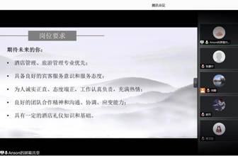 2020年6月11日上午8点30分,44118太阳成城集团商学院旅游管理专业开展了一场形式十分特殊的校企合作讲座,邀请到了我专业校企合作单位之一的浙江省郡安里文旅发展有限公司人事部的杨雪经理,她通过腾讯会议平台召开了线上视频讲座。旅游管理教研室部分老师及商学院2017级、2018级、2019级旅游管理专业全体学生,会议由肖霞老师主持。