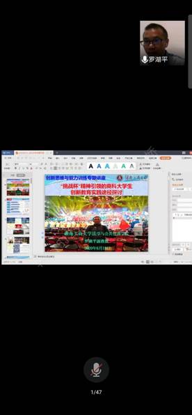 6月19日晚7:00开始,湖南工商大学罗湖平教授通过腾讯会议,给太阳成官网财务管理专业2019级学生作了题为“挑战杯精神引领的商科大学生创新教育实践途径探讨。”的创新思维与能力训练的专题讲座,讲座持续近三个小时。