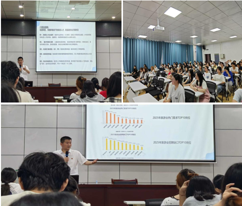 黄先生的讲座以“旅游就业与民生”为题,围绕“旅游业宏观瞭望,旅游业就业透视,旅游业民生探测,旅游业人效观察,旅游业就业方向”等五个方面作探讨。他从导游证考试、旅游企业实践,到考公考编、参军入伍,再到乡村文旅、智慧旅游等多元路径,结合专业理论知识深入浅出地解释了旅游就业对民生的重要意义,所举案例既涵盖传统就业赛道,又紧跟行业新趋势。