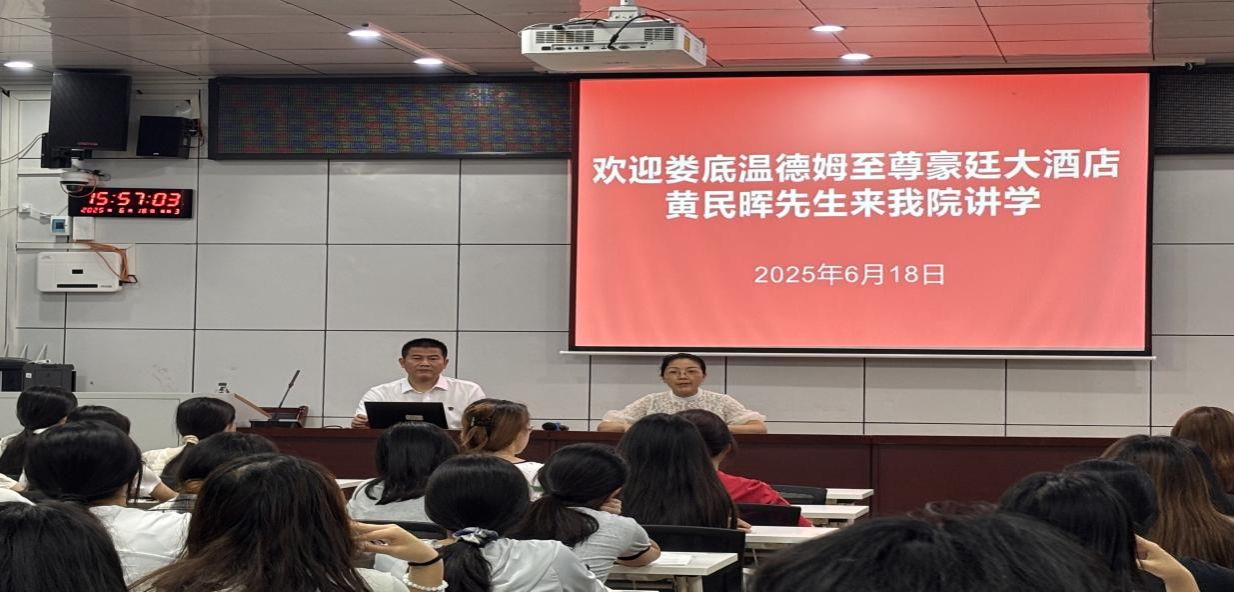 6月18日下午,娄底温德姆至尊豪廷大酒店副总经理黄民晖先生在高韵楼101教室给太阳成官网2024级旅游管理专业学生作讲座,旅游管理教研室主任谢益民老师主持。