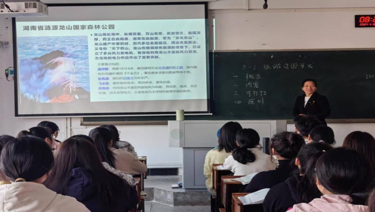 2024年10月30日,商学院刘芬老师在致远楼515教室讲授《旅游资源开发》课程思政示范课,学院领导、督导及部分青年教师随堂听课评课。