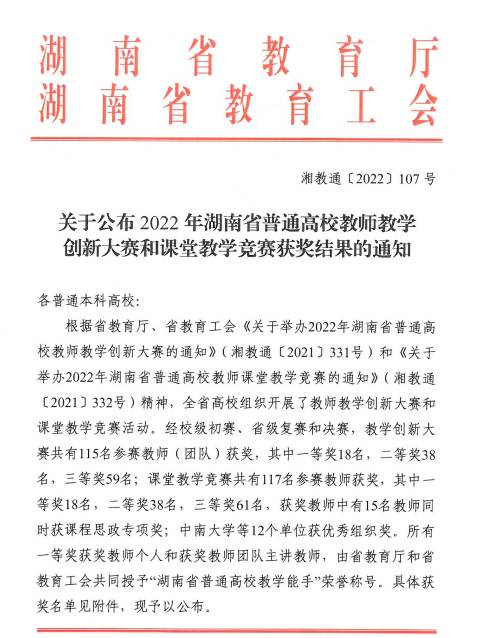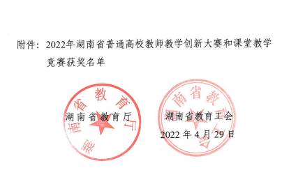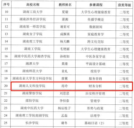 近日,从湖南省教育厅、湖南省教育工会《关于公布2022年湖南省普通高校教师教学创新大赛和课堂教学竞赛获奖结果的通知》中获得,湖南人文科技学院商学院教师肖玲荣获课堂教学竞赛文科组(含思政)二等奖。
