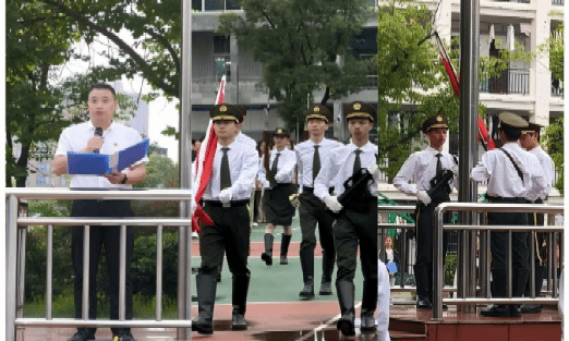 仪式第一项:升国旗、奏唱国歌。国旗护卫队迈着铿锵的步伐,护送鲜艳的五星红旗步入会场,《义勇军进行曲》随即响,全体师生肃立,行注目礼,注视着国旗冉冉升起