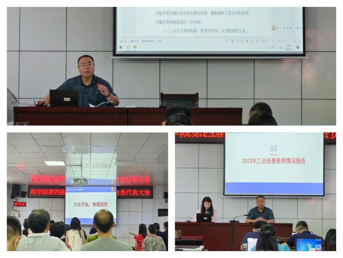 伴随着庄严的国歌声,大会正式拉开帷幕。院长刘辛田的以“继往开来、真抓实干,奋力谱写商学院高质量发展新篇章”为主题的《院行政工作报告》,总结了学院2023年的主要工作与成绩,提出了2024年的发展目标和工作任务。欧阳纯晶的《商学院分工会2023年度工作报告》和《2023年商学院分工会经费使用情况报告》回顾了2023年、展望了2024年的分工会工作,汇报了2023年分工会经费使用情况。党总支书记刘辉详细解读了《商学院二次分配暂行办法》(2024年)。
