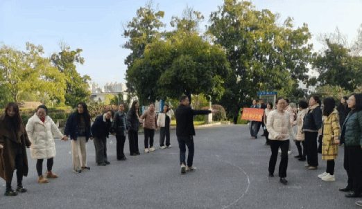 随后进行的呼啦圈穿越活动将现场气氛推向高潮,这一团队协作类游戏让女教师们充分体会到默契配合的乐趣。49名女教师被随机分为两组,人数基本均衡的两队队员手拉手围成圆圈,在不松手、不破坏圆圈的规则下,通过肢体的灵活配合传递呼啦圈。比赛过程中,两队队员彼此鼓劲、相互配合,小心翼翼又不失敏捷地完成每一次传递,场边观赛的老师纷纷为队友加油助威,整个活动现场成为一片欢乐的海洋。最终,率先完成呼啦圈一圈传递的小组赢得比赛,收获了一杯酸奶,未获胜小组也获得了精美小零食,无论胜负,大家都在协作中收获了快乐,增进了彼此的情谊。