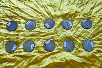 在张家界市永定区的湘鄂川黔革命根据地纪念馆内,展出的红军时期的文物——10块银元正面照 (赵宗山 摄)
