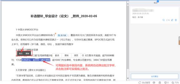 3.点击“阅读原文”查看学生提交的初稿时,教师可选择内容进行线上批注。