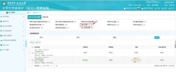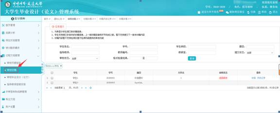 1.学生“提交初稿”后,教师登录系统后可在首页“待办事项提醒”中看到待“审核初稿”,也可在左侧导航栏“过程文档管理”中点击“审核初稿”。
