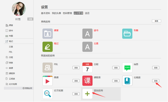 点击应用管理,显示如图界面。同学们可以按照个人意愿删除已有应用(系统应用无权限更改),也可添加新的应用。