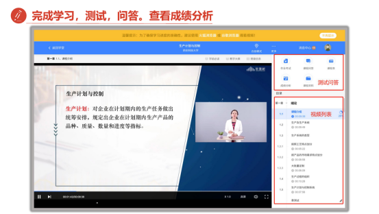 B、进入课程学习后,学习页面如下图所示。主要是课程内容,右侧是章节目录,其中进度点显示为橙色并带有数字提示,表示还有相应的任务点未完成,完成则显示为绿色。