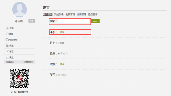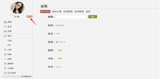 基本资料设置,同学们通过本页设置可以实现绑定邮箱、填写手机号的功能。