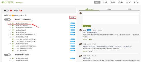 A、以徽州文化为例,点击章节知识点名称,即可进行课程学习,可以按照自己的学习进度进行课程的学习。学习进度在课程目录右侧显示。