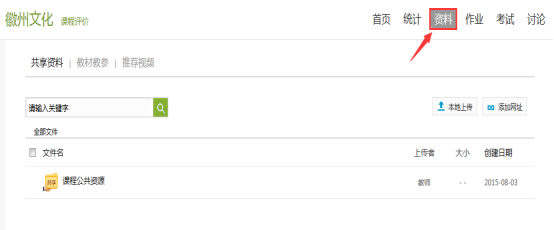 共享资料界面如下,这是一个师生共享的平台,同学们可以本地上传资料与同学共享,可查看老师和同学上传的共享的资料,资料较多难以查阅时也可以进行关键词检索。
