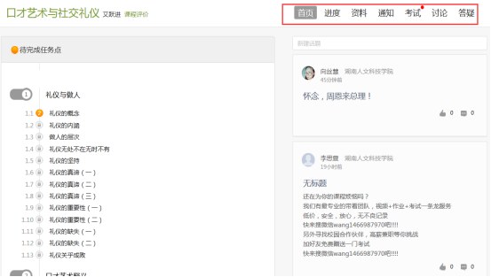 D、 空间中还包括了统计,资料,作业,考试和讨论功能。在界面右侧,同学们可以参与讨论,查看通知,查看同学,下面分别进行介绍。