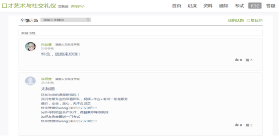 在课程空间的导航栏中点击讨论,即可进入讨论界面,学生可以在任何章节新建讨论话题,也可以在已有话题中点击回复参与讨论,老师可以对学生谈论内容加精处理,加精后的讨论显示为精华,以便学生筛选查看。除此之外,还有问答,我发表的和我回复的三个筛选条件。