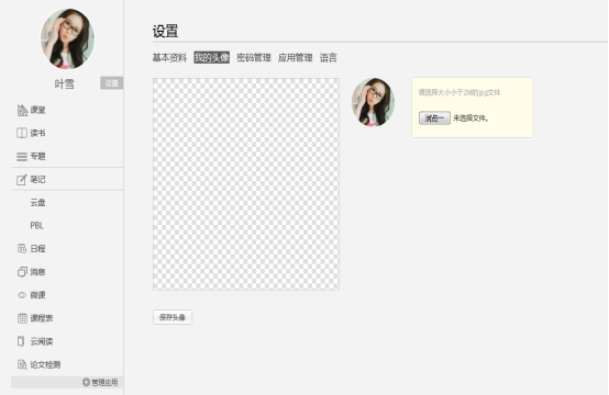 我的头像功能可以设置学生空间头像,点击浏览在本地上传后保存,头像就会显示在学生空间。