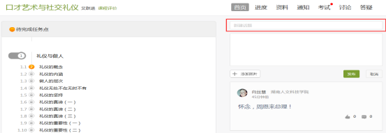 在学习页面的右侧可以发起讨论,查看、回复该课程本班内所有老师、同学的讨论。填写讨论的标题、内容,可以选择讨论的章节范围,点击发布。即完成发起讨论的操作。