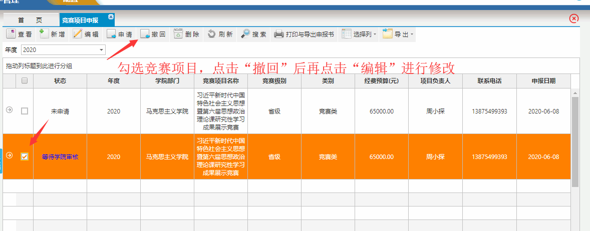 ü状态为“等待学院”的竞赛项目,需要进行调整,可以选中数据点击“撤回”进行编辑修改。(如图)