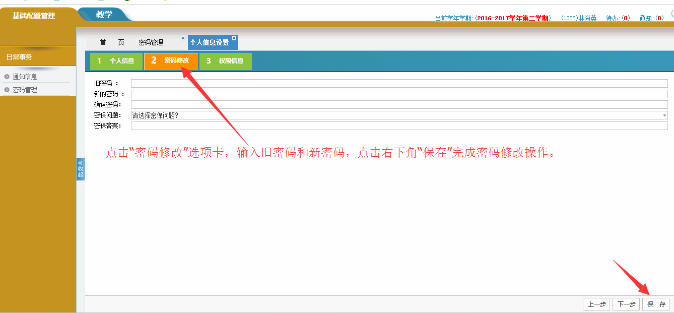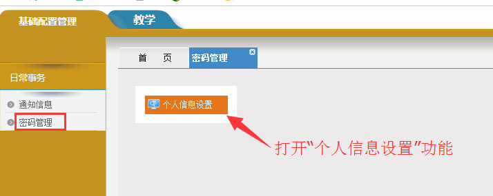 1、第一次登入后系统要求更改密码后,也可以在系统功能【基础配置管理】—【密码管理】—【个人信息设置】再次进行密码修改。如下图