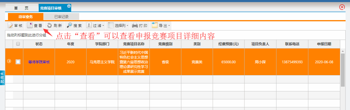 登录系统后,如有需要审核的申报竞赛项目,系统会推送待办事宜,直接点击待办事宜即可打开审核功能进行审核