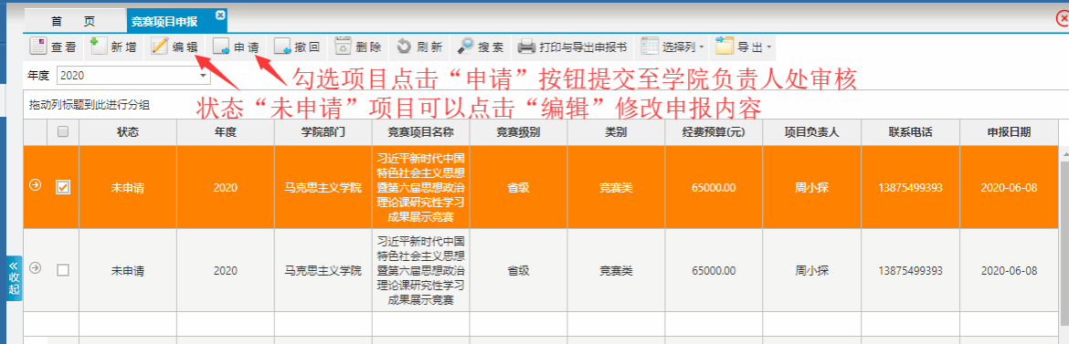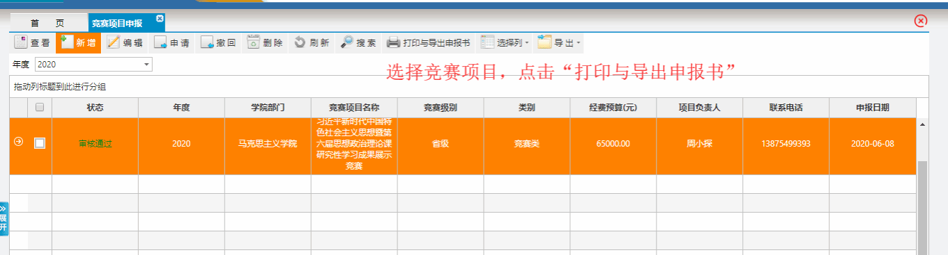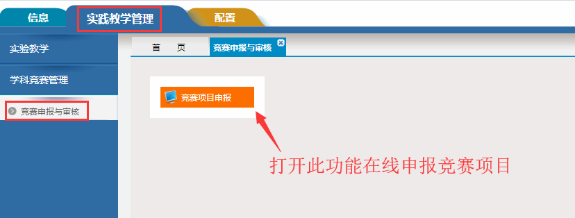 打开“实践教学管理—学科竞赛管理—竞赛申报与审核—竞赛项目申报”功能