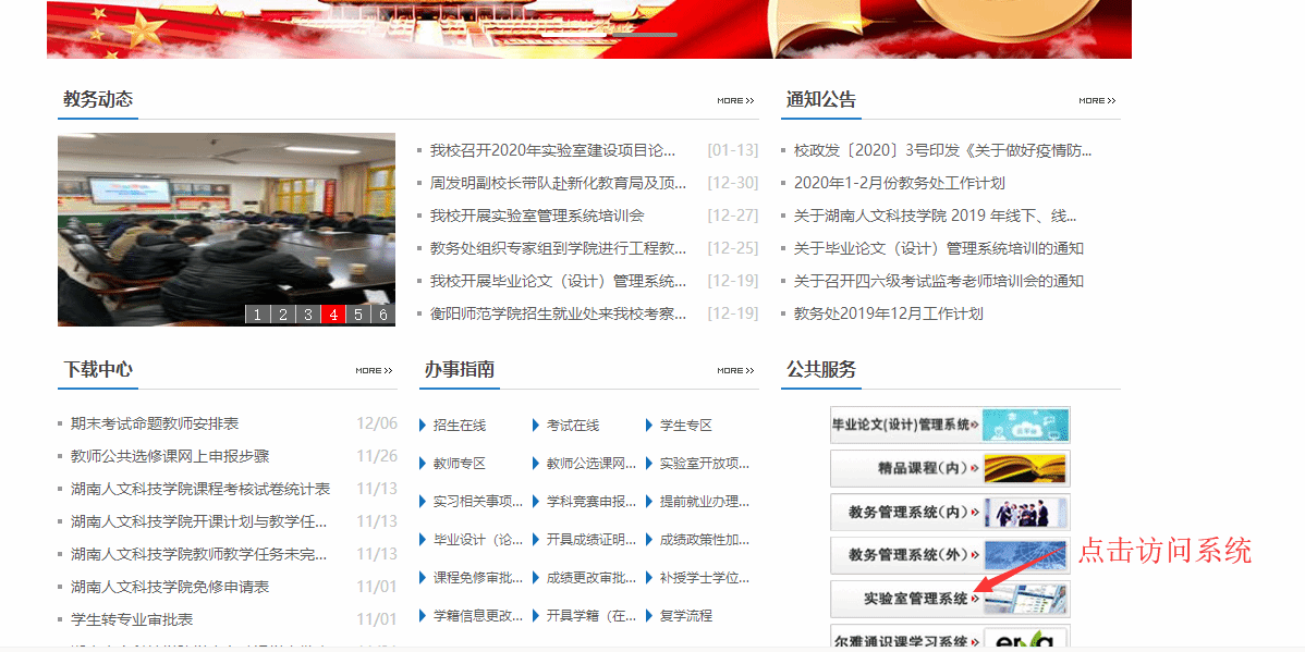 打开44118太阳成城集团官方主站,找到教务处门户网站,在公共服务栏目点击“实验室管理系统”访问系统