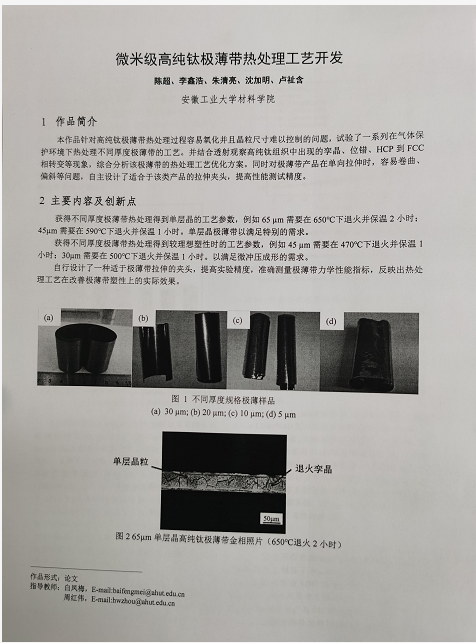 作品应以金属材料热处理和表面改性领域近两年获得的创新成果(如论文、专利及应用等),鼓励创新实践、学科交叉、有利于国计民生的与金属材料相关的创新项目,在企业生产实际中解决的技术难题。