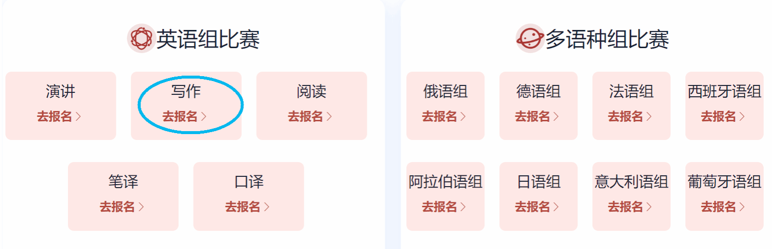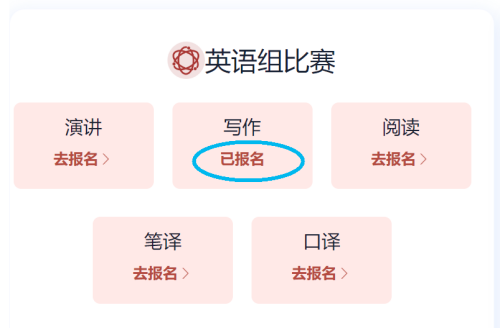 选手填完基本信息后,请点击相应比赛报名按钮,进入报名弹窗,点击“确认报名”,方视为报名成功。下面以英语组写作赛项为例展示报名流程。