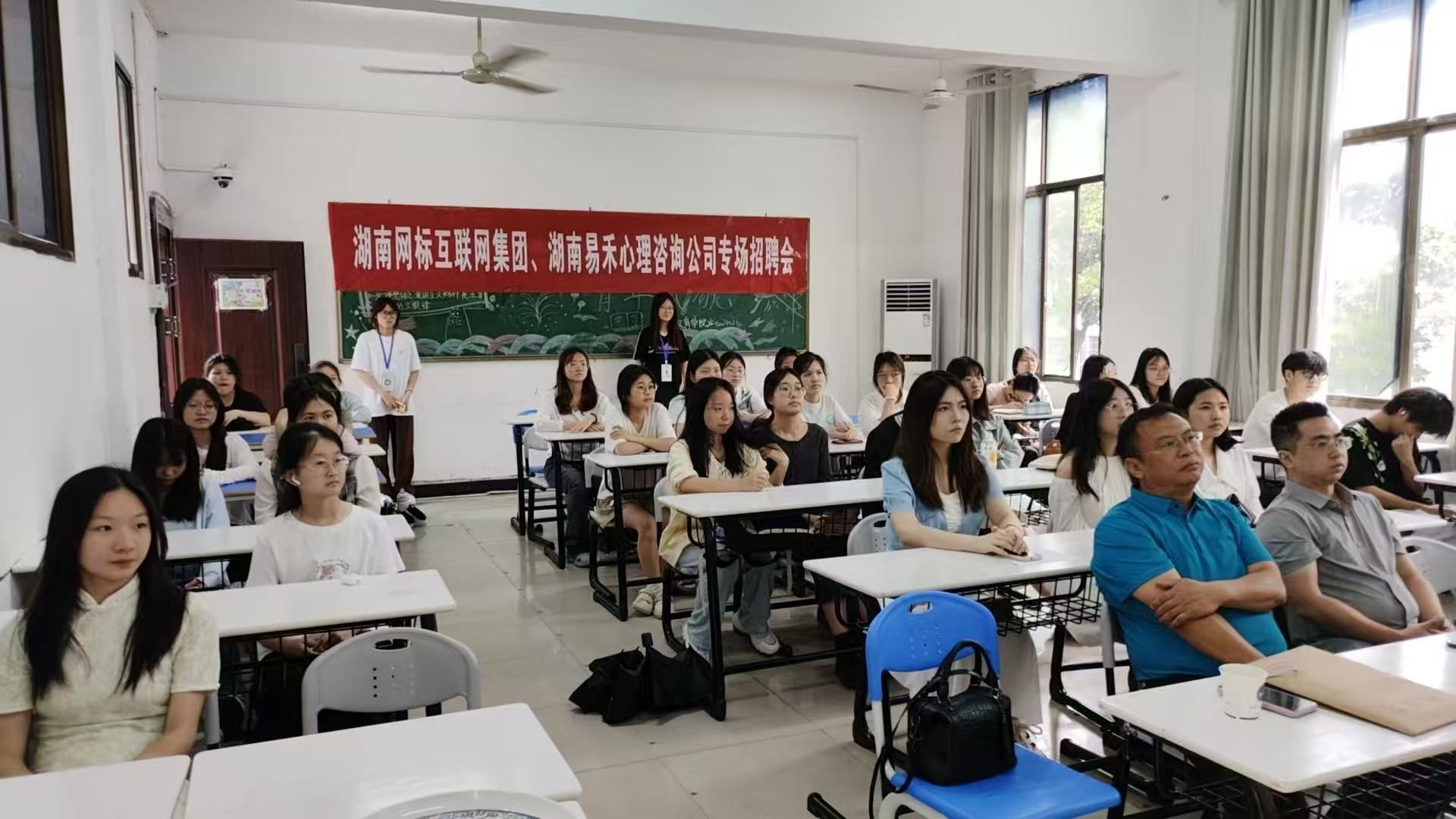 为全方位拓展就业渠道,做好毕业生就业工作,5月27日,湖南网标互联网集团、湖南易禾心理咨询公司专场招聘会在甘澍楼举行。湖南网标互联网集团曾东峰、湖南易禾心理咨询公司易胜其作招聘宣讲,应用心理学教研室主任王旭红主持招聘会,毕业年级辅导员陈福及部分2025届毕业生参加招聘会。