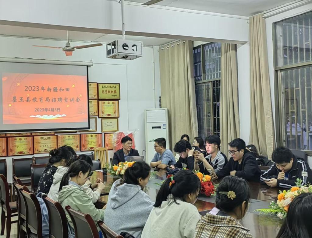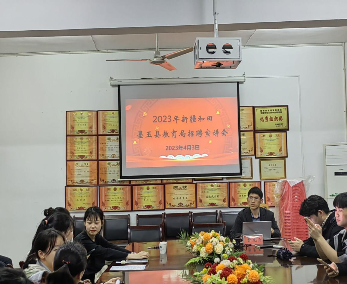 田密对到访的新疆和田墨玉县教育局招聘组表示热烈欢迎和感谢,并希望在座的准毕业生们在当前严峻的就业形势下抓住这次招聘机会。曹龙云通过播放视频和ppt展示带领同学们走进了美丽的新疆和田墨玉县,领略当地风土人情、学校风采。他结合自身经历讲述当地教育系统对人才的重视,介绍同学们关心的福利待遇、个人发展前景及未来墨玉县的整体发展趋势。宣讲结束后,曹云龙耐心回答了毕业生所提出的困惑,依次讲述了自己的看法和解决方式。