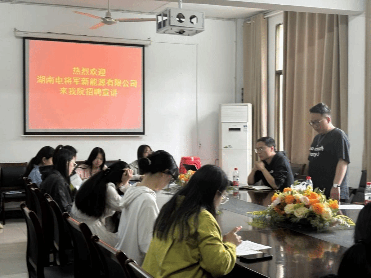 4月25日下午,湖南电将军新能源有限公司招聘宣讲会于甘澍楼304举行。教育学院20级部分在校毕业生,21级、22级部分学生干部参加。辅导员陈福主持会议。
