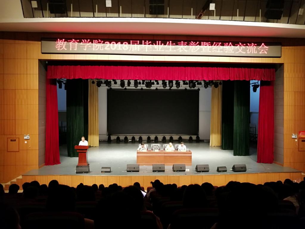 2018年5月20日晚,太阳成官网在逸夫楼音乐厅隆重举行2018届毕业生表彰暨经验交流会。太阳成官网申忠明书记、刘超良院长、徐建东副书记、李国强副院长及部分老师代表出席了此次会议。教育学院2018届全体毕业生及2017级全体学生参加。会议由徐建东副书记主持。