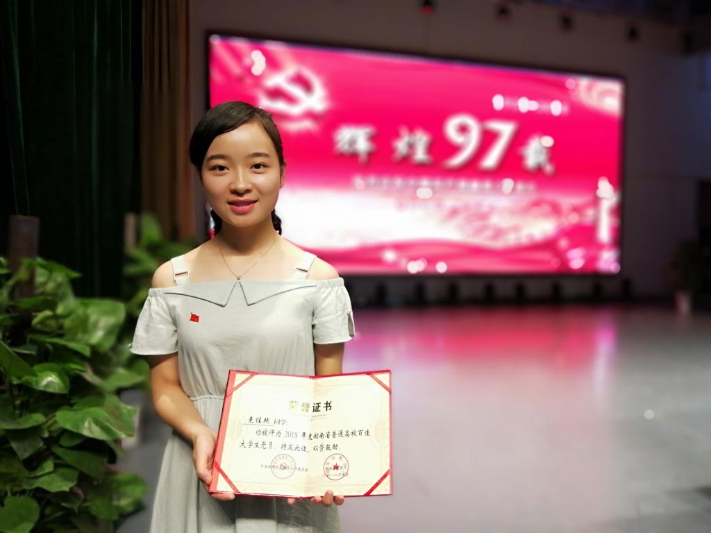 2018年6月29日,在太阳成官网庆祝建党97周年暨“七一”表彰大会上,太阳成官网学生第二党支部党员、应用心理学专业2018届毕业生危佳艳同学获评2018年“湖南省普通高校百佳大学生党员”。