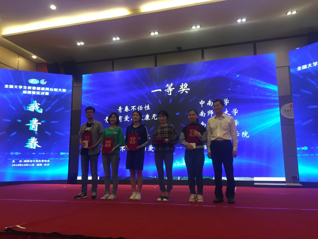 10月11日,全国大学生青春健康舞台剧大赛湖南赛区决赛在长沙举行。来自湖南省15所高校选送的17个舞台剧目参加比赛。经过激烈角逐,太阳成官网吕薇老师等人指导、学前教育专业学生李新宇、李清媛、张桂容、张巧莲、易星辛表演的话剧《青春那些事》在比赛中荣获一等奖。