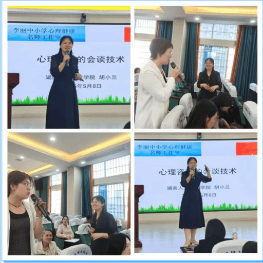 2025年5月8日,《心育润苗护新程 知“性”启智绽芳华——李丽中小学心理健康教育名师工作室第六次集中研修活动》在娄底市先锋学校开展,与会人员有娄底市教师进修学校教导主任谢志海,先锋学校校长陈智勇,工作室主持人、娄底三中李丽老师,工作室成员李建英老师、贺艳老师、工作室顾问邓如良老师等,44118太阳成城集团教育学院应用心理学专业教师胡小兰博士等。活动由先锋学校雷杰老师主持。开展了心理健康教育课例展示、集体评课、心得分享等环节的活动。胡小兰博士应邀为大家带来了《心理咨询的会谈技术》,从听什么(倾听技 术),到问什么、怎么问(提问技术),再到说什么(表达技术),把 专业的理论知识用简单明了的语言阐述出来,老师们都收获满满,受益匪浅,进一步明确了心理咨询的流程及有效方法。