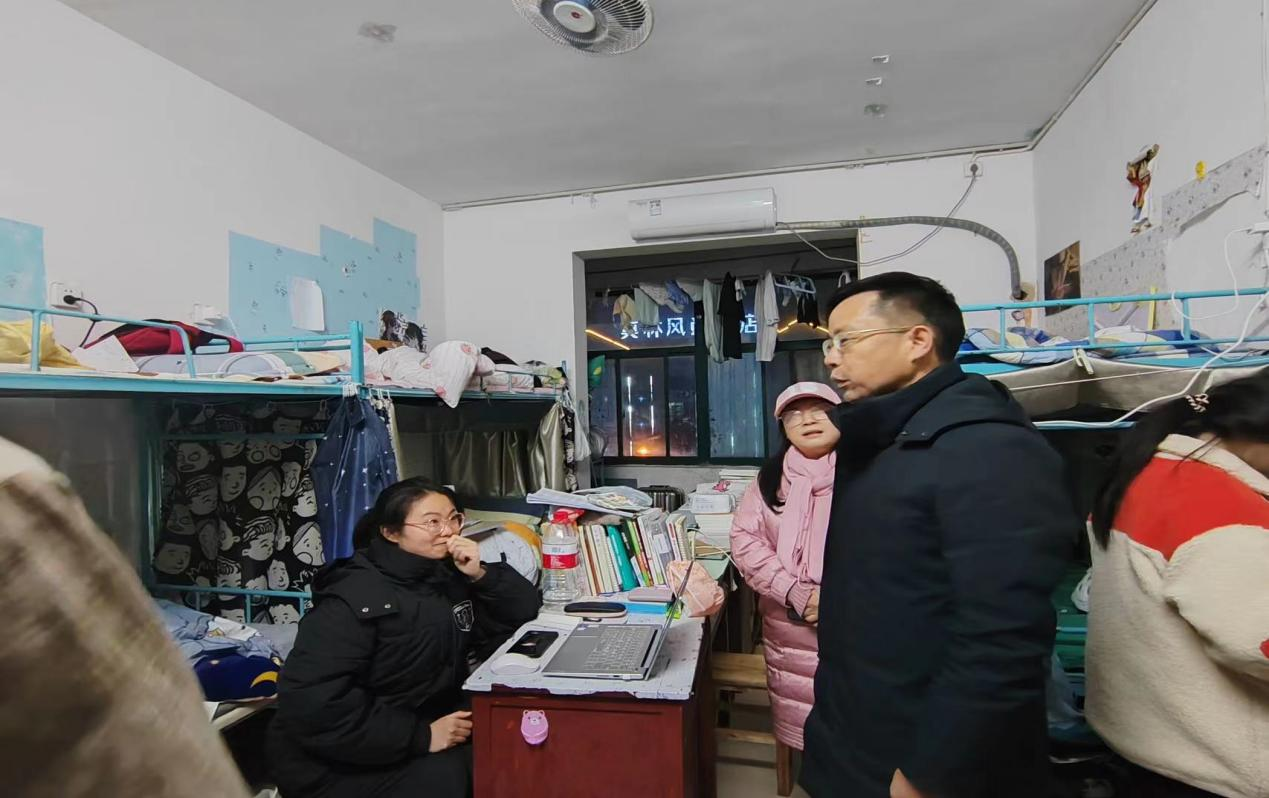 领导、老师们到寝室与同学们亲切交流,向同学们强调安全的重要性,检查同学们是否按时归寝,寝室卫生状况并提出让同学们做好因疫情推迟开展的期末考试的复习、认真诚信参考等要求。同时了解并听取同学们对宿舍管理的意见和建议。由于近期连续阴雨天气,空气潮湿,老师叮嘱学生们注意保暖防护,多加衣物,强调了寝室用电安全问题。